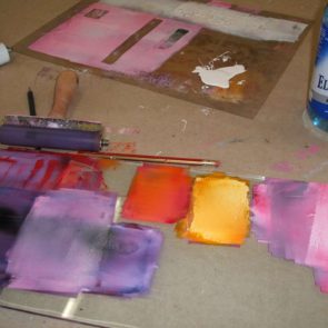 Mit Pinseln oder Walzen tragen wir auf Platten Farben auf. In die feuchte Farbe hinein kann man zeichnen, kratzen oder malen, so dass hier durch Abdruck auf einem Blatt Papier Flächen und Linien entstehen, die ausgesprochen interessant und malerisch sind und beliebig oft überdruckt werden können. Auch „unfertige“ Bilder strahlen einen großen Reiz aus, und mit Chiffren, Flächen und Linien entstehen herrliche Geschichten. Wir werden von Hand drucken, weil eine Druckpresse solche Blätter nicht hervorzaubern kann!