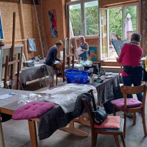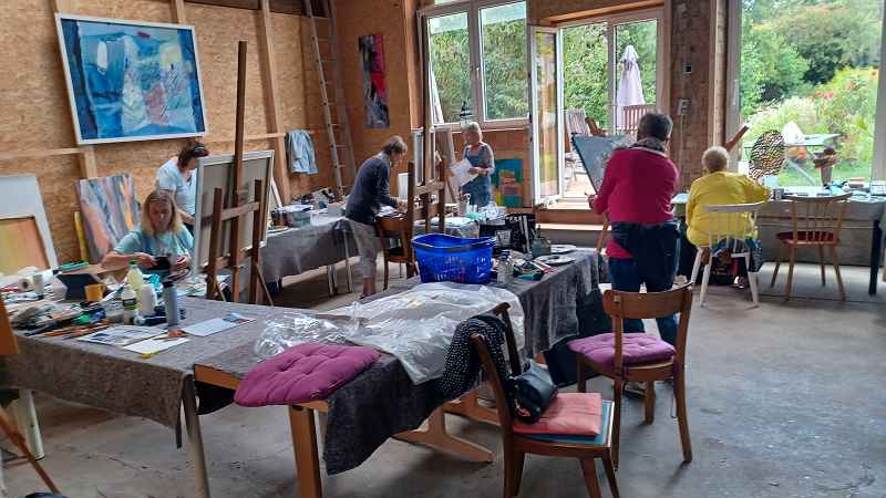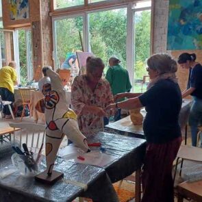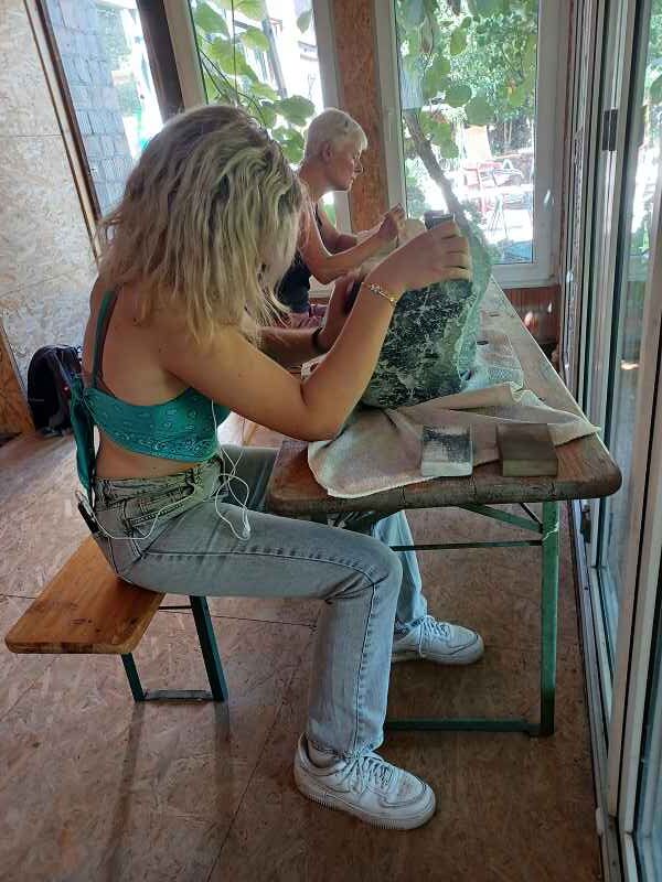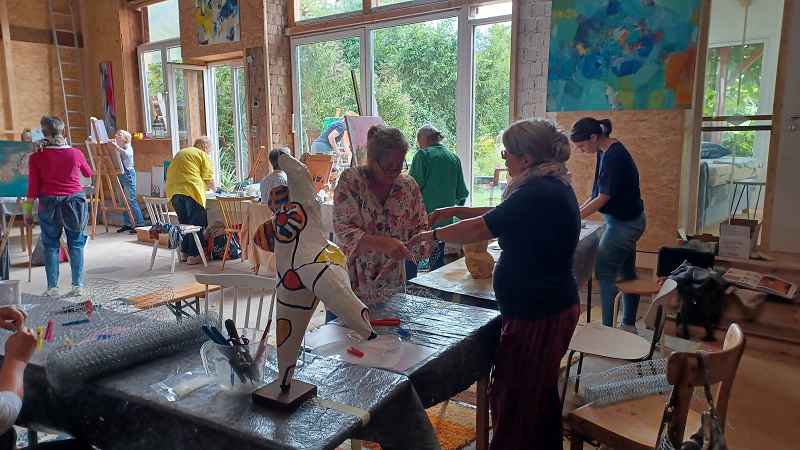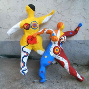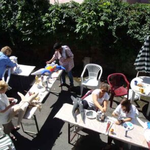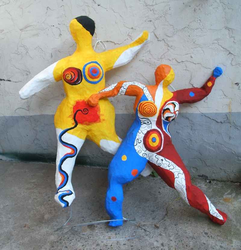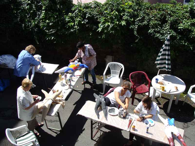 Der Workshop mit 2 Dozentinnen bietet uns die Möglichkeit, in drei Gruppen mit vielen unterschiedlichen Themen und Materialien zu experimentieren, zeichnen, malen, collagieren, Objekte wie Nanas, Stühle oder Phantasiefiguren zu bauen mit Draht und Zeitung, die hinterher bemalt werden, oder Speckstein-Skulpturen zu schaffen.